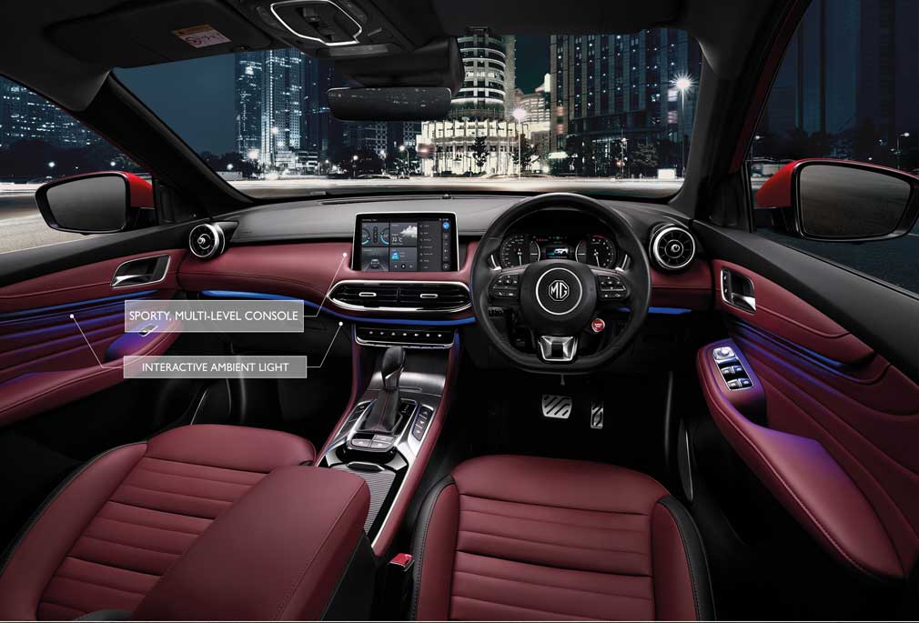 Interior quality is where the MG HS Essence truly shines. The cabin features premium leather upholstery, stitched dashboard panels, ambient lighting, and metallic accents. The infotainment system is large and visually appealing, while the digital instrument cluster adds a modern touch.